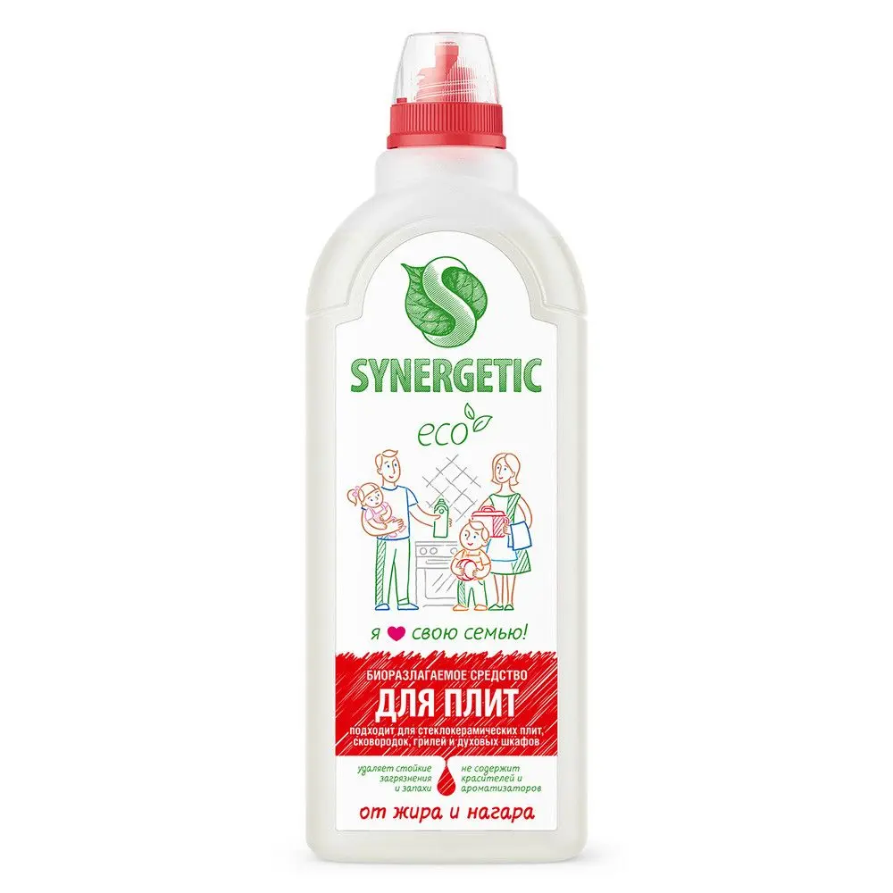 Биоразлагаемое средство для плит от жира и нагара SYNERGETIC - высокоэффективное щелочное средство для удаления жира, нагара, копоти, масляных пятен и накипи с плит и других кухонных поверхностей. Комплекс биоразлагаемых растительных тензидов и соды справляется с органическими загрязнениями за считанные минуты. Кальцинированная сода создает необходимую для расщепления пятен щелочную среду и растворяет масложировые компоненты загрязнений. Средство подходит для металлических, стеклокерамических, эмалированных плит и поверхностей, сковородок, противней, кастрюль, шампуров, решёток-гриль, пароконвектоматов, микроволновых печей, духовых шкафов, каменных столешниц, керамической плитки. Средство устраняет неприятные запахи, эффективно даже в холодной воде, полностью смывается, не оставляя разводов и царапин. Оно подходит для уборки в детских учреждениях, а также безопасно для септических установок. Попадая в среду септика, средство "понятно" для микроорганизмов и без труда распадается на простые соединения.