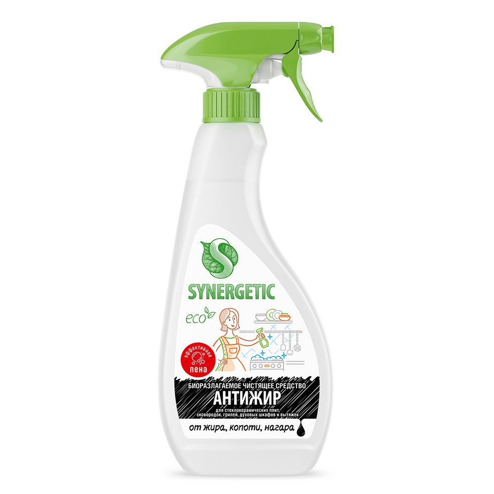 Высокоэффективное чистящее средство "Антижир" SYNERGETIC с усиленной формулой предназначено для уборки кухонных поверхностей от стойких жировых загрязнений, копоти, нагара, масляных пятен и накипи. Предназначено для стеклокерамических, металлических, эмалированных плит и поверхностей, сковородок, противней, кастрюль, шампуров, решёток-гриль, пароконвектоматов, микроволновок, вытяжек, духовых шкафов, каменных столешниц, керамической плитки и других кухонных поверхностей. Эффективная стойкая пена отлично распределяется по поверхности и обеспечивает быстрое удаление въевшегося и пригоревшего жира, не оставляя царапин. Обладает свежим цитрусовым ароматом благодаря гипоаллергенной парфюмерной композиции с эфирными маслами мандарина, лемонграсса, лимона, апельсина и перечной мяты. Средство устраняет неприятные запахи, эффективно даже в холодной воде, полностью смывается, не оставляя разводов. Средство подходит для уборки в детских учреждениях, оно также безопасно для септических установок. Попадая в среду септика, оно "понятно" для микроорганизмов и без труда распадается на простые соединения.
