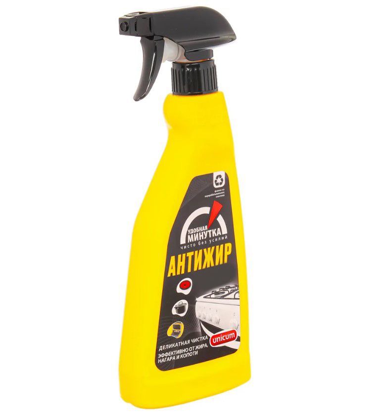 Чистящее средство для кухни АНТИЖИР удаляет жировые загрязнения, не царапает, легко смывается.