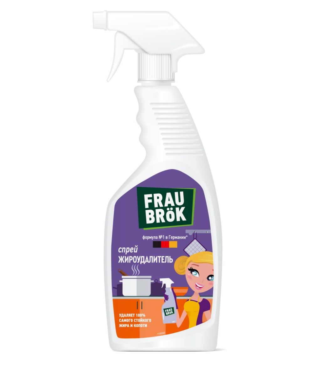 Привет, я – фрау Брок! И я в уборке знаю толк. Часами оттирать засохшие пятна жира? Ну уж нет! Теперь у тебя есть мощный жироудалитель Frau Brök. Его безопасная* рецептура с добавлением эффективных немецких компонентов на 100% отмоет даже 1000-летнюю засохшую грязь. Спрей в два счета удалит жир, нагар и копоть с поверхностей кухонных плит, духовых шкафов, решеток-гриль, кастрюль, сковород и кафельной плитки, оставив после себя только кристальную чистоту и свежесть. FRAU BRÖK - и уборка в удовольствие!