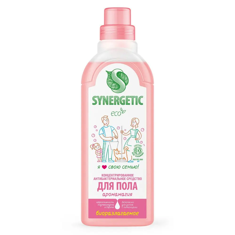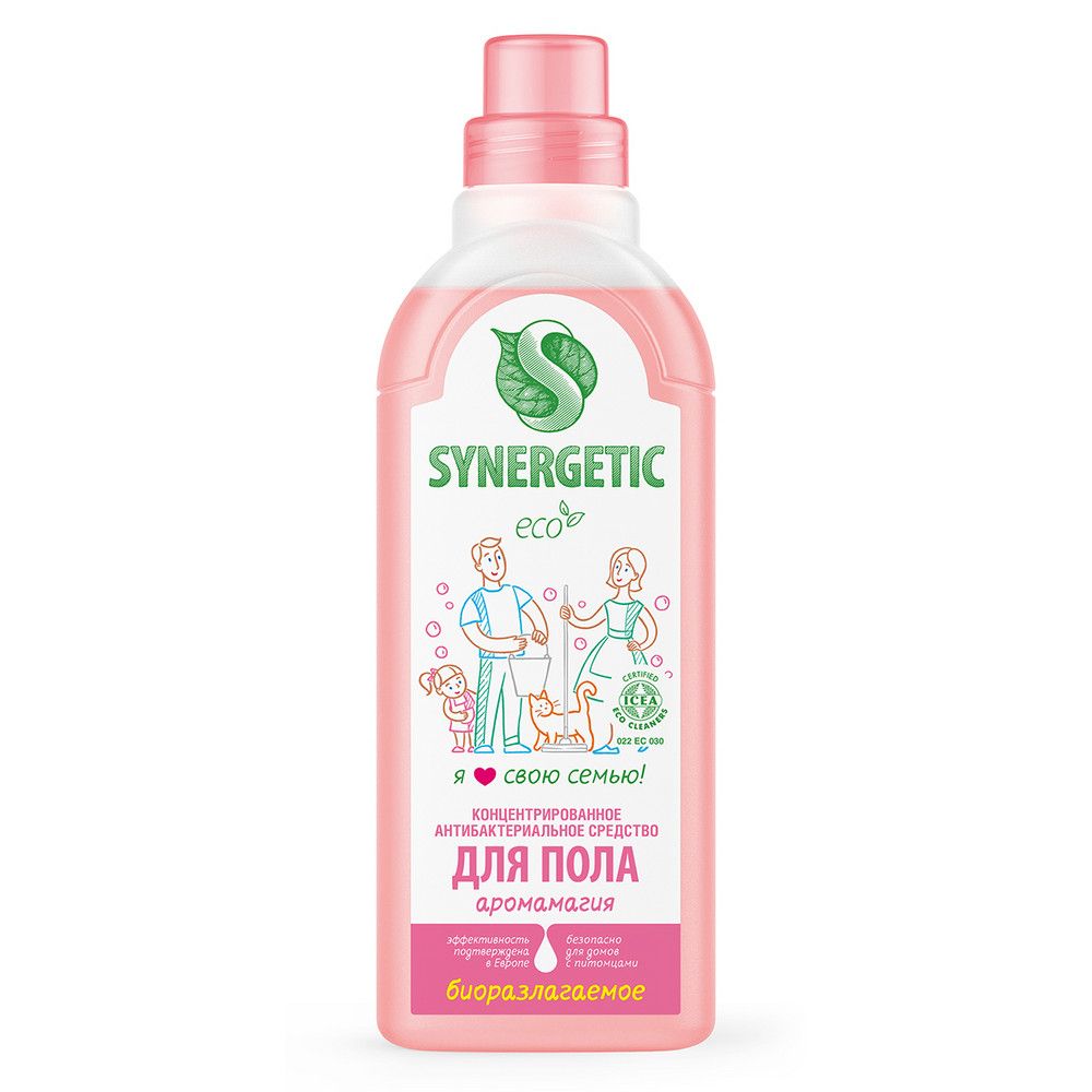 Биоразлагаемое концентрированное средство с антибактериальным эффектом SYNERGETIC "Аромамагия" - универсальное средство для ежедневной и генеральной уборки пола и других поверхностей: столов, стен, потолка. Уникальный комплекс растительных тензидов эффективно удаляет загрязнения и неприятные запахи даже в холодной воде. Комплекс зеленых хелатов предотвращает повторное оседание загрязнений на поверхности. Подходит для паркета, ламината, плитки, линолеума, металла, стекла, пластика, дерева. Гипоаллергенная парфюмерная композиция на основе эфирных масел жасмина, герани, нероли и розы оставляет легкий и приятный аромат. Международный экологический сертификат ICEA подтверждает биоразлагаемость, безопасность и эффективность средства. Оно не требует смывания, не оставляет разводов на поверхности, подходит для уборки в детских комнатах и учреждениях, а также безопасно для домов с питомцами.