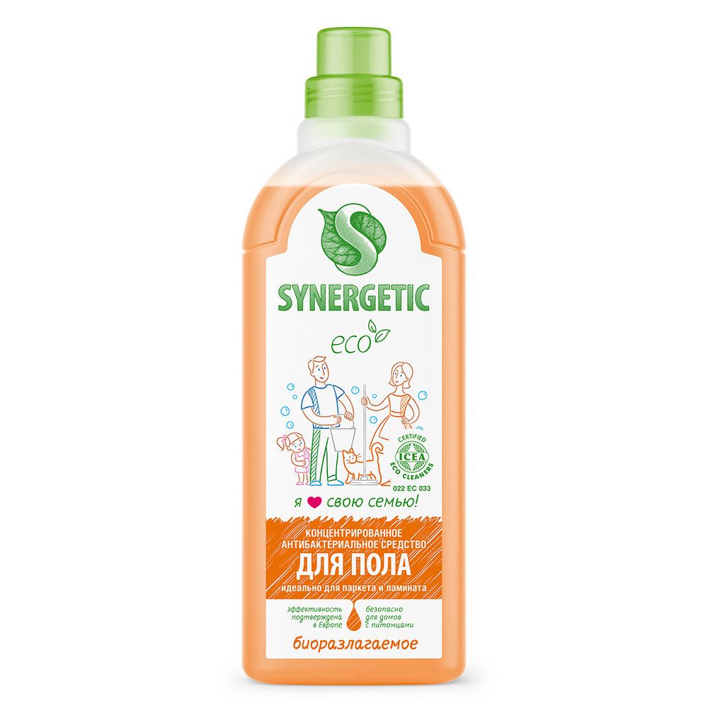 Биоразлагаемое концентрированное средство с антибактериальным эффектом SYNERGETIC - универсальное средство для ежедневной и генеральной уборки пола и других поверхностей: столов, стен, потолка. Уникальный комплекс растительных тензидов эффективно удаляет загрязнения и неприятные запахи даже в холодной воде. Комплекс зеленых хелатов предотвращает повторное оседание загрязнений на поверхности. Подходит для паркета, ламината, плитки, линолеума, металла, стекла, пластика, дерева. Гипоаллергенная парфюмерная композиция на основе эфирных масел сантала, бергамота, мяты и лимона оставляет легкий и приятный аромат. Международный экологический сертификат ICEA подтверждает биоразлагаемость, безопасность и эффективность средства. Оно не требует смывания, не оставляет разводов на поверхности, подходит для уборки в детских комнатах и учреждениях, а также безопасно для домов с питомцами.