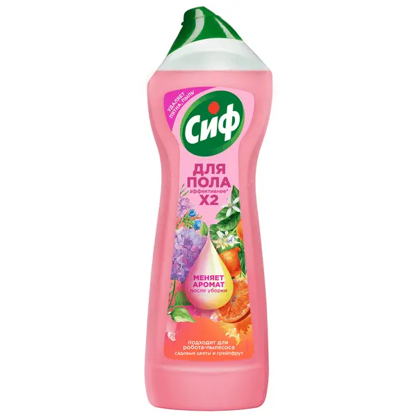 Средство для мытья пола Сиф — это идеальное решение для уборки дома, которое сочетает в себе высокую эффективность и приятный аромат. Разработанная с использованием инновационных технологий, эта жидкость для мытья полов в 2 раза эффективнее*. Средство для мытья полов Сиф обеспечивает устранение до 100% загрязнений**. С помощью моющего средства Сиф вы сможете легко удалить пятна и пыль с различных напольных поверхностей, включая линолеум, ламинат, натуральный паркет, плитку, камень и т.д. Благодаря уникальной технологии смены аромата, во время уборки вы сможете насладиться нежным цветочным ароматом, а после завершения процесса в вашем доме остается приятный запах сочного грейпфрута. Гель-концентрат для мытья полов не содержит хлор и не требует смывания. Моющее средство для пола Садовые цветы и грейпфрут безопасно для использования в домах с детьми и животными. Гель для уборки дома подходит для использования в роботах-пылесосах.