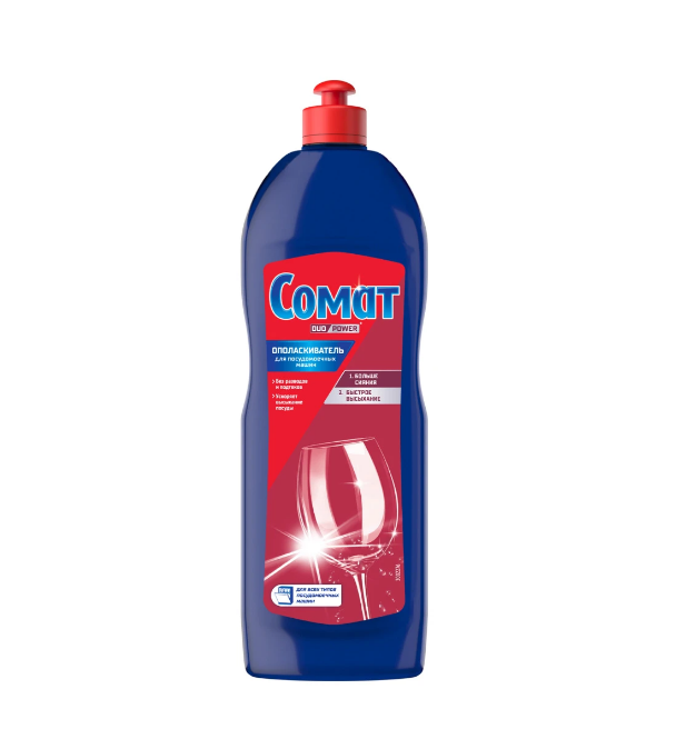 Ополаскиватель для посудомоечной машины Сомат придает посуде сияющий блеск. Кроме того, средство ускоряет высыхание посуды. Ополаскиватель Сомат предотвращает появление разводов на посуде от капель воды. Встречайте новый ополаскиватель Сомат с улучшенной формулой для большего блеска!