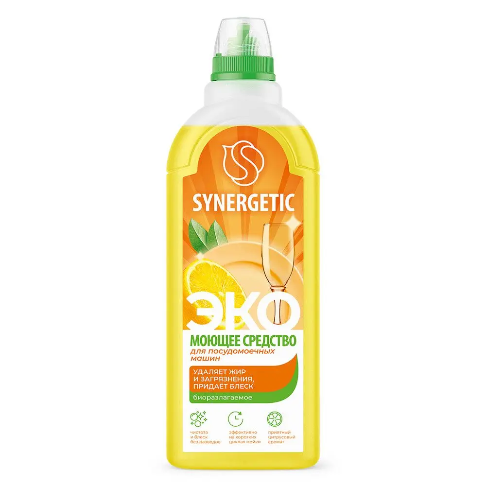 Биоразлагаемое концентрированное средство для посудомоечных машин SYNERGETIC - универсальное средство для мытья посуды, столовых приборов и кухонного инвентаря в посудомоечных машинах любого типа. Оно эффективно даже на коротких циклах мойки. Средство полностью смывается водой и подходит для мытья детской посуды. Комплекс растительных Н-тензидов и соды удаляет сложные загрязнения, растворяет жир, качественно и бережно очищает посуду и столовые приборы. Специальные добавки защищают машину от накипи, предотвращают повторное оседание загрязнений, придают блеск, не оставляют разводов и известкового налета на поверхности посуды. Гипоаллергенная парфюмерная композиция на основе натуральных эфирных масел лимона, лемонграсса и лайма придает средству приятный цитрусовый аромат. Пищевой краситель в низких концентрациях придает гелю нежно-желтый цвет. Биоразлагаемые компоненты не вредят микрофлоре септических установок. Попадая в среду септика, средство «понятно» для микроорганизмов и без труда распадается на простые соединения.