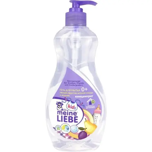 Концентрированный эко гель для мытья детской посуды, игрушек, фруктов и овощей Майне Либе обеспечивает безопасное и эффективное очищение всех видов детской посуды (бутылочки, пустышки и т.д), игрушек (в том числе пластиковых, деревянных, резиновых и металлических), а также овощей и фруктов от любых загрязнений. Средство не содержит отдушки, фосфатов, хлора, формальдегидов, растворителей, красителей, продуктов нефтехимии и прочих агрессивных компонентов, не вызывает аллергии и одобрено дерматологами с первых дней жизни малыша.
