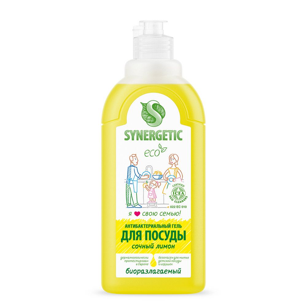 Биоразлагаемый концентрированный гель для посуды с антибактериальным эффектом SYNERGETIC - это экологичное, безопасное и эффективное средство для мытья всех видов посуды, в том числе детской, кухонного инвентаря и детских игрушек от любых видов загрязнений. Он не оставляет следов на посуде. Мягкие биоразлагаемые тензиды из растительного масла обеспечивают хорошее пенообразование и эффективно удаляют жир и запахи даже в холодной воде. Глицерин растительного происхождения в составе средства защищает кожу рук от сухости и раздражения. Гипоаллергенная парфюмерная композиция на основе эфирных масел лимона, померанца, петитгрейна, лемонграсса и лайма придает средству свежий и приятный аромат. Гель дерматологически протестирован в Европе. Международный экологический сертификат ICEA подтверждает биоразлагаемость, безопасность и эффективность средства. Биоразлагаемые компоненты безопасны для природы и человека и не вредят микрофлоре септических установок при использовании средства в соответствии со способом применения.