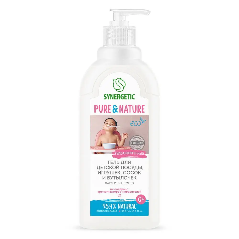 Биоразлагаемый концентрированный гель для детской посуды SYNERGETIC - это экологичное, безопасное и эффективное средство для мытья детской посуды, сосок, бутылочек, игрушек и прочих товаров детского ассортимента от любых видов загрязнений. Мягкие биоразлагаемые тензиды из растительного масла обеспечивают хорошее пенообразование и эффективно удаляют жир и запахи даже в холодной воде. Глицерин растительного происхождения в составе средства защищает кожу рук от сухости и раздражения. Не содержит красителей и ароматизаторов, легко смывается водой. Средство дерматологически протестировано в Европе. Международный экологический сертификат ICEA подтверждает биоразлагаемость, безопасность и эффективность средства. Биоразлагаемые компоненты безопасны для природы и человека и не вредят микрофлоре септических установок при использовании средства в соответствии со способом применения. Гипоаллергенный гель для мытья детской посуды имеет экомаркировку "Листок жизни". Этот знак на упаковке - гарантия экологической безопасности продукта для человека и окружающей среды. Дерматологически протестировано независимым исследовательским институтом Dermatest® в Германии.