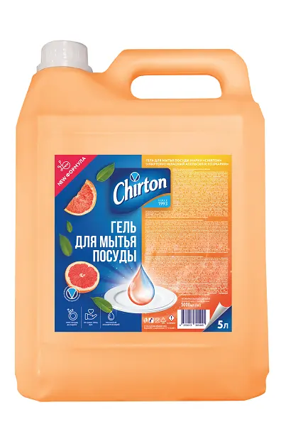 Гель для мытья посуды марки "Chirton" (Чиртон).Специальное чистящее средство предназначенное для мытья посуды как в горячей так и в холодной воде.Быстро и эффектично растворяет жир ,смывает остатки пищи и устраняет запахи. Придает посуде блеск. Полностью смывается чистой водой.Не сушит кожу рук.Имеет приятный аромат.