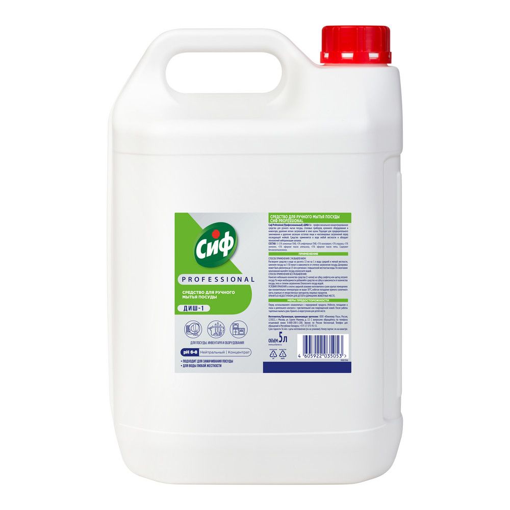 Cif Professional (Профессиональный) «ДИШ-1» - профессиональное концентрированное средство для ручного мытья посуды, столовых приборов, кухонного оборудования и инвентаря, удаления легких загрязнений в зоне кухни. Подходит для предварительного замачивания и удаления засохших остатков пищи и масложировых загрязнений перед последующей мойкой. Средство применяется в воде любой жесткости и обладает технологией нейтрализации запахов. Подходит для воды любой жесткости. Подходит для замачивания посуды.