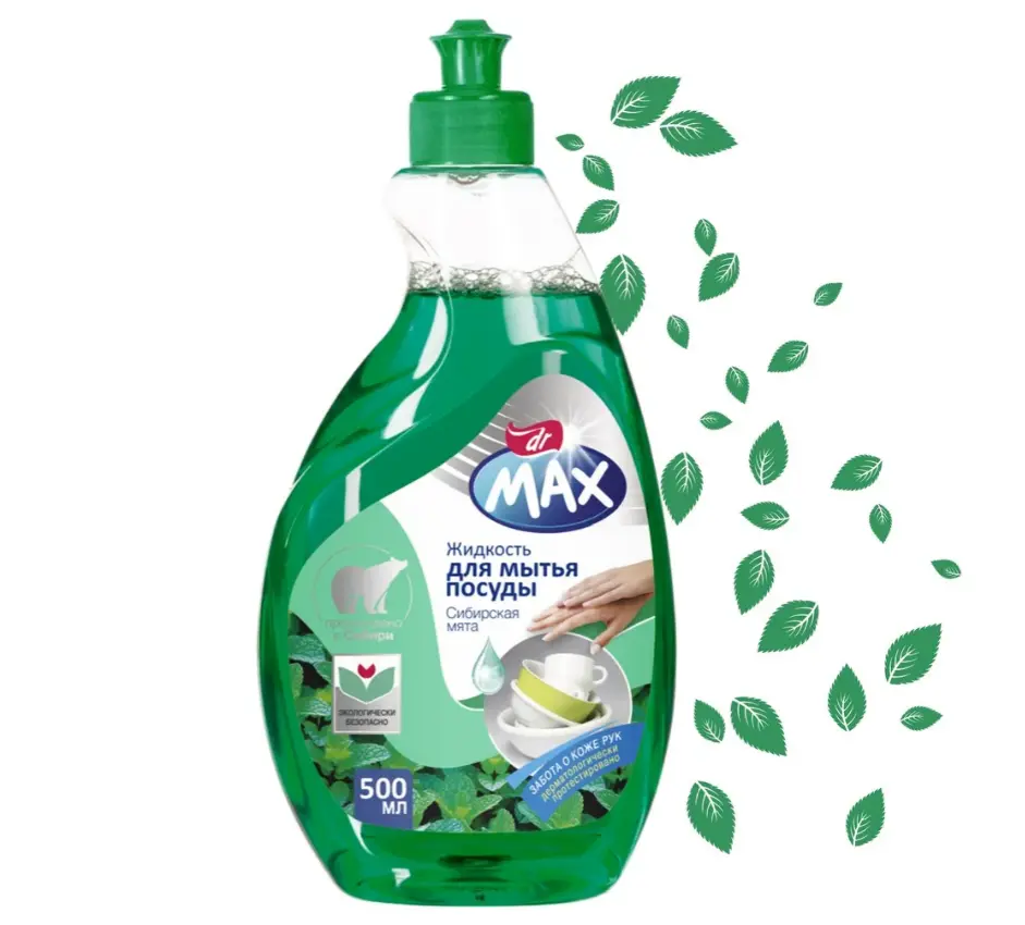 Гель для посуды прошел дерматологические испытания. Моющее средство dr MAX «Сибирская мята» содержит безопасные ингредиенты, которые не сушат и не раздражают кожу.