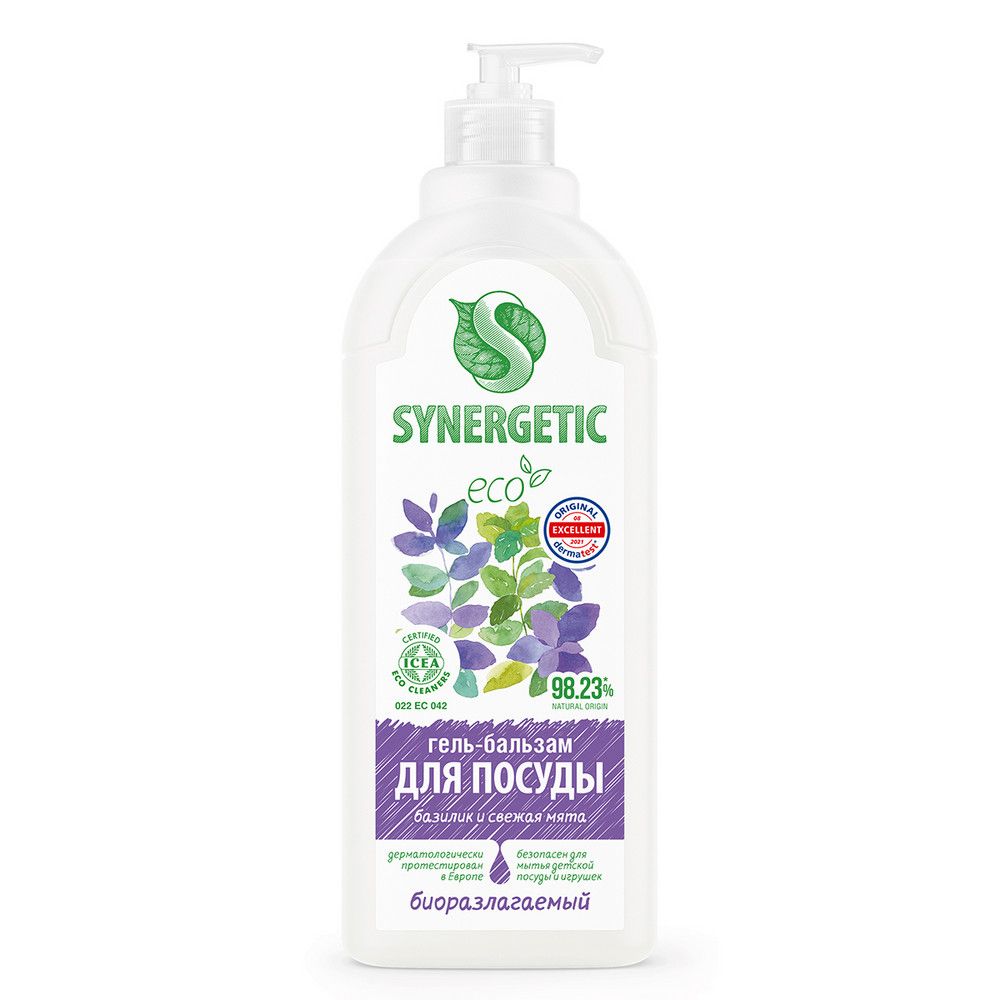 Биоразлагаемый гель-бальзам для мытья посуды и детских игрушек SYNERGETIC "Базилик и свежая мята" - это экологичное, безопасное и эффективное средство для мытья всех видов посуды, в том числе детской, кухонного инвентаря и детских игрушек от любых видов загрязнений. Легко смывается водой и не оставляет следов на посуде. Содержит ухаживающие компоненты для увлажнения кожи рук. Комплекс биоразлагаемых ПАВ из растительного масла и энзимов эффективно удаляет жир и сложные загрязнения даже в холодной воде, придавая посуде зеркальный блеск. Нейтрализует неприятные запахи. Экстракты ламинарии и спирулины питают и увлажняют кожу рук, делая ее более мягкой, повышая эластичность. Эффективность средства подтверждена в Германии. Гипоаллергенная парфюмерная композиция с эфирными маслами гвоздики, эвкалипта, мяты, апельсина и лемонграсса придает средству нежный и приятный аромат. Международный экологический сертификат ICEA подтверждает биоразлагаемость, безопасность и эффективность средства. Подходит для чувствительной кожи.
