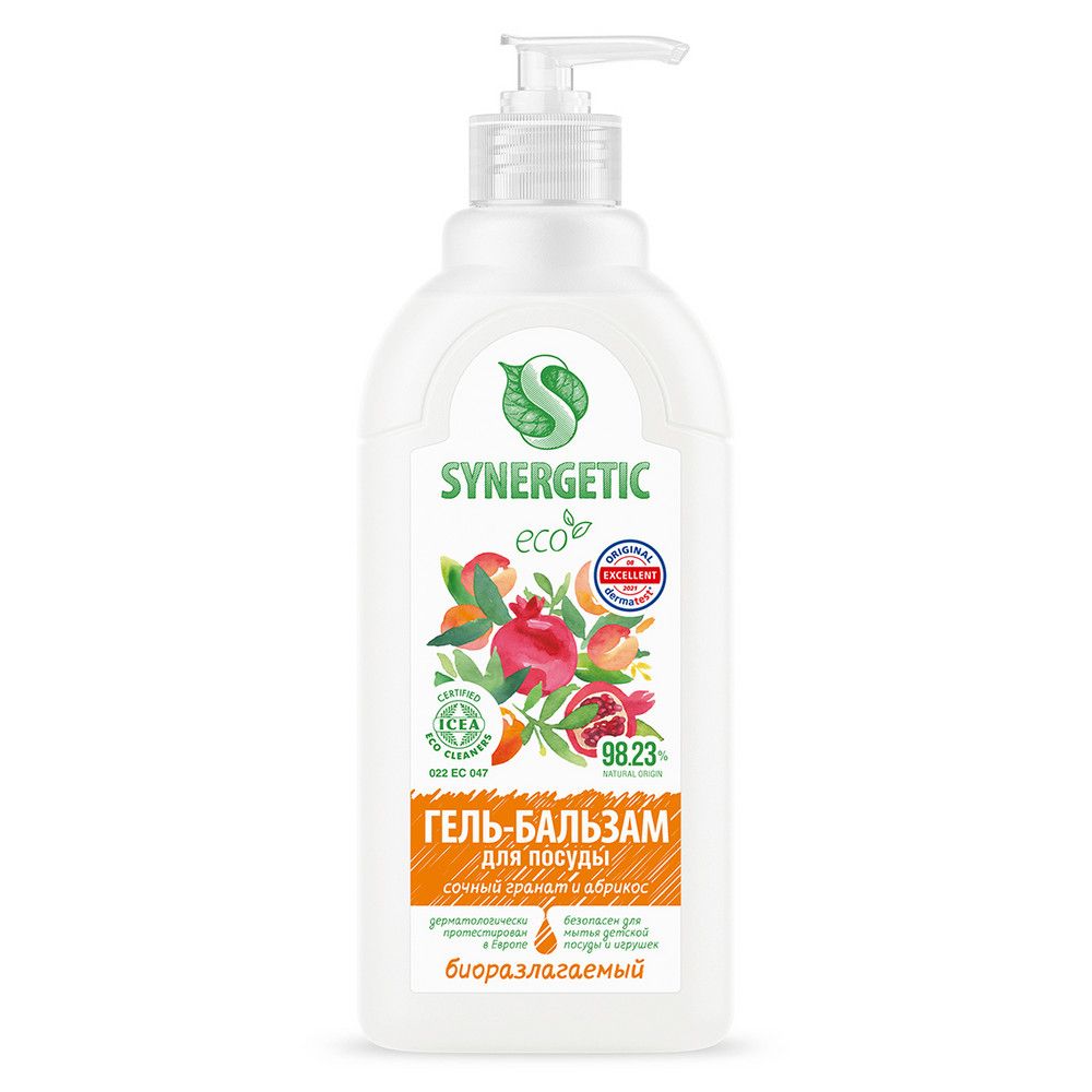 Биоразлагаемый гель-бальзам для мытья посуды и детских игрушек SYNERGETIC "Сочный гранат и абрикос" - это экологичное, безопасное и эффективное средство для мытья всех видов посуды, в том числе детской, кухонного инвентаря и детских игрушек от любых видов загрязнений. Легко смывается водой и не оставляет следов на посуде. Содержит ухаживающие компоненты для увлажнения кожи рук. Комплекс биоразлагаемых ПАВ из растительного масла и энзимов эффективно удаляет жир и сложные загрязнения даже в холодной воде, придавая посуде зеркальный блеск. Нейтрализует неприятные запахи. Экстракты ламинарии и спирулины питают и увлажняют кожу рук, делая ее более мягкой, повышая эластичность. Эффективность средства подтверждена в Германии. Гипоаллергенная парфюмерная композиция с эфирными маслами эвкалипта и апельсина придает средству нежный и приятный аромат. Международный экологический сертификат ICEA подтверждает биоразлагаемость, безопасность и эффективность средства. Подходит для чувствительной кожи.