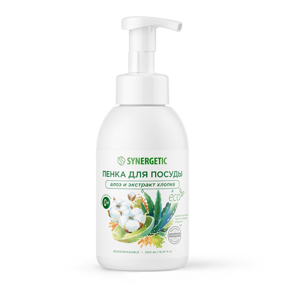 Synergetic биоразлагаемая гипоаллергенная пенка для мытья посуды детской посуды и игрушек алоэ и экстракт хлопка 500 мл