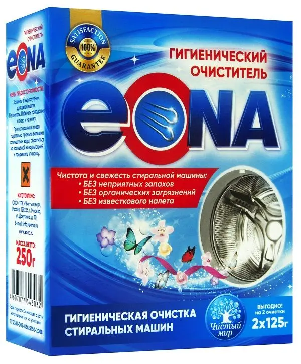Специально разработанное средство для гигиенической очистки внутри стиральных машин - нагревательных элементов, барабана, труб и других труднодоступных мест, от органических загрязнений и известкового налета. Очиститель накипи EONA удаляет неприятные запахи и накипь, очищает стиральную машину и она становится гигиенически чистой, а белье свежим. В одной упаковке два пакета, каждый из которых разовая доза 125 гр