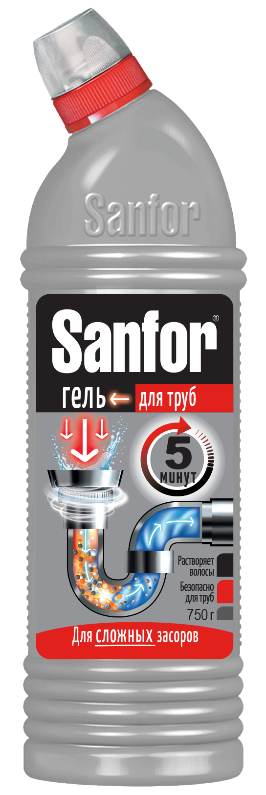Sanfor «Для труб» — универсальное средство для чистки труб. Мощная формула геля за считанные минуты справляется с самыми сильными засорами.
