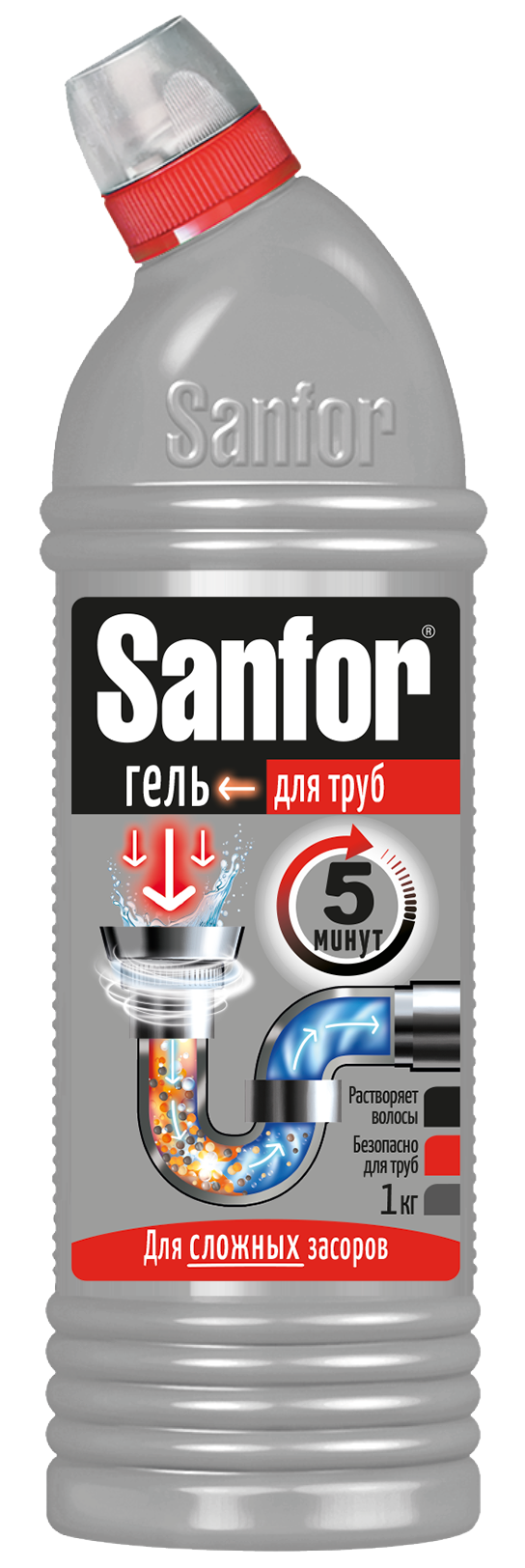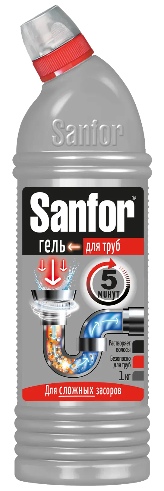 Sanfor «Для труб» — универсальное средство для чистки труб. Мощная формула геля за считанные минуты справляется с самыми сильными засорами.