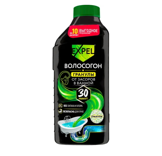 Когда засоры в ванной становятся реальной проблемой, на помощь приходит профессиональное средство для прочистки труб – EXPEL ВОЛОСОГОН! Благодаря специально разработанному составу на основе композиции тройного действия ОКИСЛИТЕЛЬ + ЩЁЛОЧЬ +ПАВы, достигается высокая эффективность средства и его исключительное быстродействие.