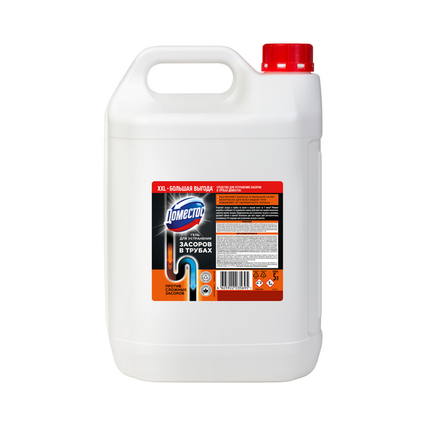 Доместос специальное чистящее средство для устранения засоров в трубах помогает устранить даже самые сложные засоры на кухне и в ванной всего за 7 минут’. Доместос гель для устранения засоров в трубах растворяет волосы, мыльный налет, остатки пищи (жировые, белковые, углеводные, овощные, фруктовые). Больше не нужно переживать, что средство закончится в самый неподходящий момент - покупайте знакомые продукты в упаковке 5 литров. Большой объем – большая выгода’’! Доместос для прочистки труб от засоров борется с неприятными запахами, бактериями и плесенью, которые сопровождают засоры. Доместос гель для устранения засоров в трубах безопасен для всех видов труб: металлических, металлопластиковых, чугунных или полимерных. Доместос специальное чистящее средство для устранения засоров в трубах: -помогает устранять даже самые сложные засоры в раковине, душевой кабине и ванной всего за 7 минут’; -смывает микробы и борется с неприятными запахами; -безопасен для всех видов труб; -упаковка продукта пригодна к переработке’’’; -имеет биоразлагаемую формулу; -в большой упаковке - до 2 раз меньше пластика*. Средство Доместос от засоров труб можно использовать на кухне, в ванной комнате или душе.