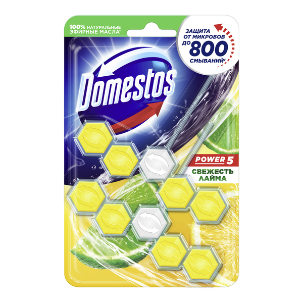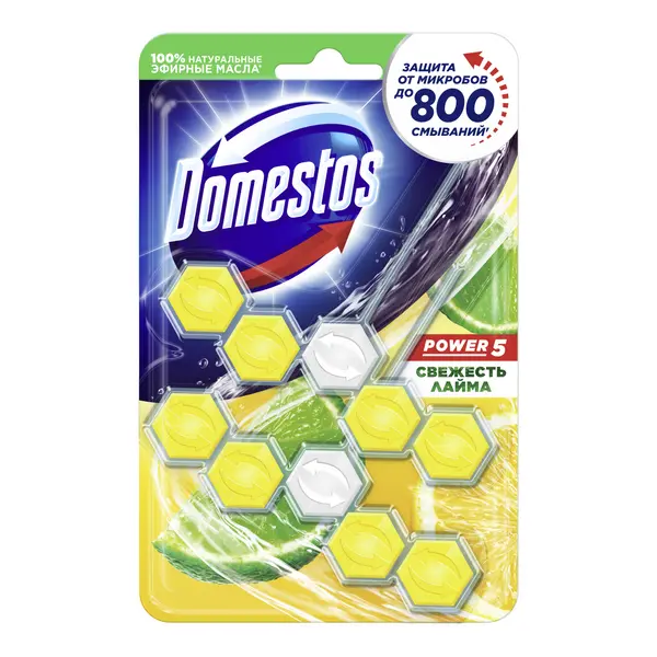 Блок для очищения унитаза Domestos Power 5 Антиналет Свежесть Лайма против известкового налета и неприятного запаха — это пять преимуществ, помогающих обеспечить защиту от загрязнений и микробов и сохранить чистоту и блеск. При каждом смывании появляется бодрящий аромат лайма на срок до 4 часов и обильная пена, которая борется с налетом, поддерживая гигиену и блеск поверхности унитаза.Блок для туалета Доместос содержит активное вещество, которое под действием напора воды ополаскивает всю поверхность унитаза, защищая от бактерий и помогая предотвращать известковый налет.Блок для унитаза Domestos Power 5 Антиналет Свежесть Лайма:-предотвращает известковый налет;-борется с неприятными запахами;-удаляет грязь и микробы обильной пеной;-оставляет приятный аромат после смывания;-содержит 2 блока в упаковке;-работает до 1,5 раз дольше*.