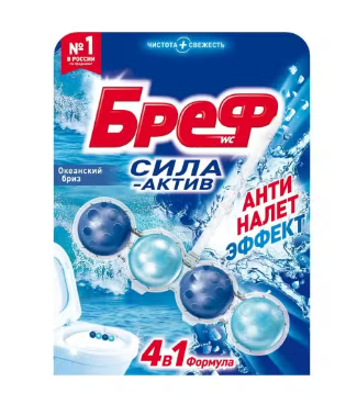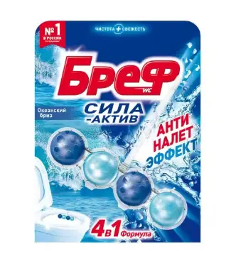 Блок для унитаза БРЕФ Сила-Актив Океанский бриз – подвесной туалетный блок с формулой против известкового налета. Активная формула с антиналет эффектом действует в 4 направлениях: образует очищающую пену, которая обеспечивает гигиеническую чистоту; предотвращает образование известкового налета; помогает предотвратить повторное загрязнение; придает туалетной комнате свежий аромат океана после каждого смывания. БРЕФ Сила-Актив придает антиналет эффект при каждом смывании.