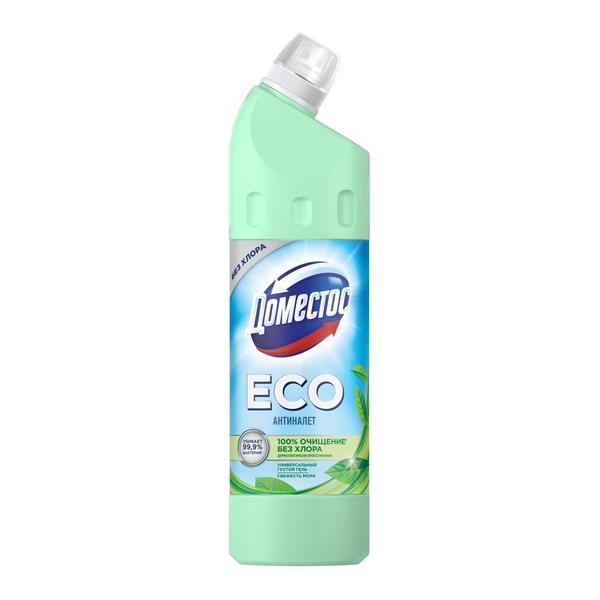 Эко средство для сантехники Domestos ECO Антиналет Свежесть Моря без хлора — это уникальная* комбинация эффективности и приятного аромата. Domestos ECO с формулой на основе лимонной кислоты от известкового налета устраняет сложные минеральные загрязнения, ржавые потеки и мочевой камень в унитазе. Доместос ЭКО Антиналет без хлора Свежесть Моря содержит антимикробный компонент природного происхождения, убивающий до 99,9% бактерий. Domestos ECO Антиналет Свежесть Моря: -не содержит ПАВы искусственного происхождения, хлор, фосфаты и парабены: -подходит для уборки ванной комнаты, мытья полов и очищения унитаза; -имеет густую и экономичную формулу; -содержит биоразлагаемые активные природные компоненты; -хранится в пригодной к переработке упаковке. Эко чистящее средство для уборки дома Антиналет Свежесть Моря без хлора — это густой антибактериальный гель для сантехники, который экономично расходуется. Эко гели Доместос Антиналет универсальны: их можно использовать для уборки дома для поддержания чистоты и гигиены любых поверхностей**.