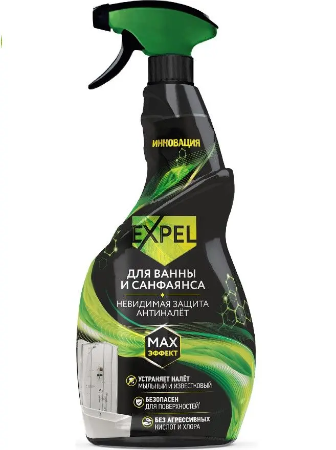 Ванная и туалетная комната, как правило, занимает не так много пространства в квартире, но, как и кухня, является местом наиболее частого посещения и активного использования. как членами семьи, так и гостями дома. А потому требуют особого внимания и тщательного ежедневного ухода.Чтобы этот уход не отнимал у вас много времени и сил, предлагаем воспользоваться современным средством – Спреем для санфаянса EXPEL.Инновационная формула спрея EXPEL двойного действия на основе лимонной кислоты усилена особыми полимерами, которые создают тонкий невидимый защитный слой АНТИНАЛЁТ. С одной стороны, лимонная кислота быстро и эффективно удаляет въевшуюся грязь, мыльные разводы и избавляет от известкового налёта, с другой – защитный слой не дает каплям воды с остатками мыла и частицами грязи задерживаться на поверхности, что обеспечивает её равномерное высыхание без пятен и разводов.Благодаря невидимой защите АНТИНАЛЁТ поверхность дольше остаётся чистой, что позволяет существенно сократить ваши время- и трудозатраты на поддержание идеального порядка в ванной. Проведите это время с пользой! С EXPEL грязь и пятна уЛетучиваются!• Эффективная формула на основе лимонной кислоты легко справляется с въевшейся грязью, мыльными разводами и известковым налётом• Создает защитный слой: препятствует образованию новых пятен и разводов• Не повреждает эмаль и металлические поверхности• Без агрессивных кислот и щелочей• Без едкого запаха• Подходит для септика
