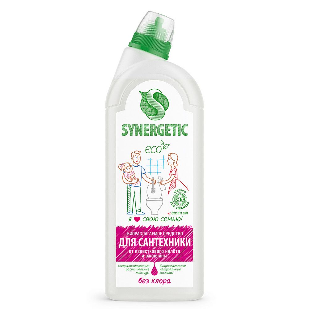 Биоразлагаемое универсальное средство для сантехники SYNERGETIC - концентрированное чистящее средство для ежедневной уборки поверхностей, устойчивых к кислотным моющим средствам, в ванных комнатах и санузлах: унитаза, раковины, ванны, душевой кабины, керамической плитки, акриловых, фаянсовых и эмалированных поверхностей. Комплекс натуральных кислот (лимонной, гликолевой и молочной) и Н-тензидов, полученных из растительного масла, устраняет известковый налёт, ржавчину, камень и минеральные загрязнения даже в холодной и жесткой воде. Средство с антибактериальным эффектом убивает микробы и бактерии, а также эффективно устраняет неприятные запахи. Гипоаллергенная парфюмерная композиция с маслами сантала, бергамота, мяты и лимона оставляет свежий аромат. Международный экологический сертификат ICEA подтверждает биоразлагаемость, безопасность и эффективность средства. Средство полностью смывается водой, не содержит хлор, фосфаты, оптические отбеливатели, SLS, SLES, агрессивные кислоты и ПАВ. Биоразлагаемые компоненты не вредят микрофлоре септических установок.