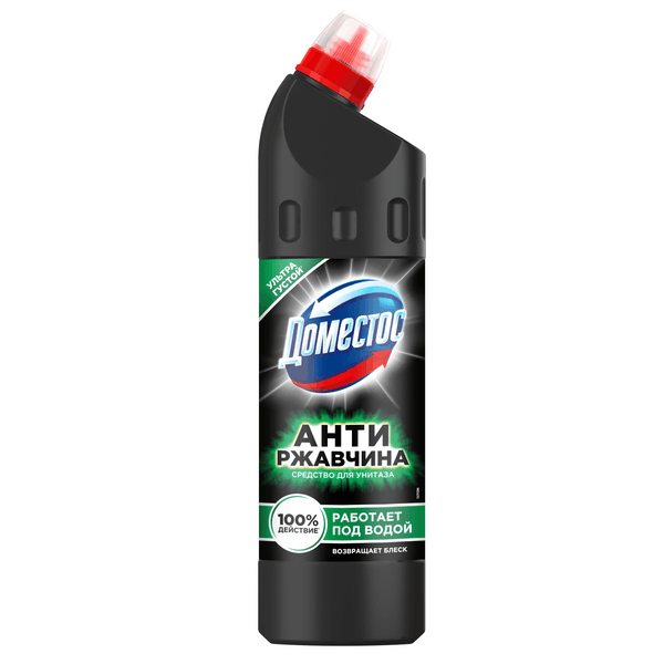 Чистящее средство для унитаза Domestos Antirjavchina создано специально для борьбы с трудноудаляемыми загрязнениями в туалете. Доместос Антиржавчина содержит в своем составе сбалансированную стабилизацию соляной кислоты, которая эффективно помогает поддерживать ржавые потеки, желтизну, мочевой камень и известковый налет. Благодаря густой текстуре Domestos Антиржавчина равномерно распределяется по внутренней поверхности изделия, помогая справиться с сильными загрязнениями и бактериями, особая формула позволяет средству работать даже под водой. Доместос Антиржавчина: - Удаляет ржавые потёки, следы от жесткой воды и известковый налёт; - Борется с микробами;