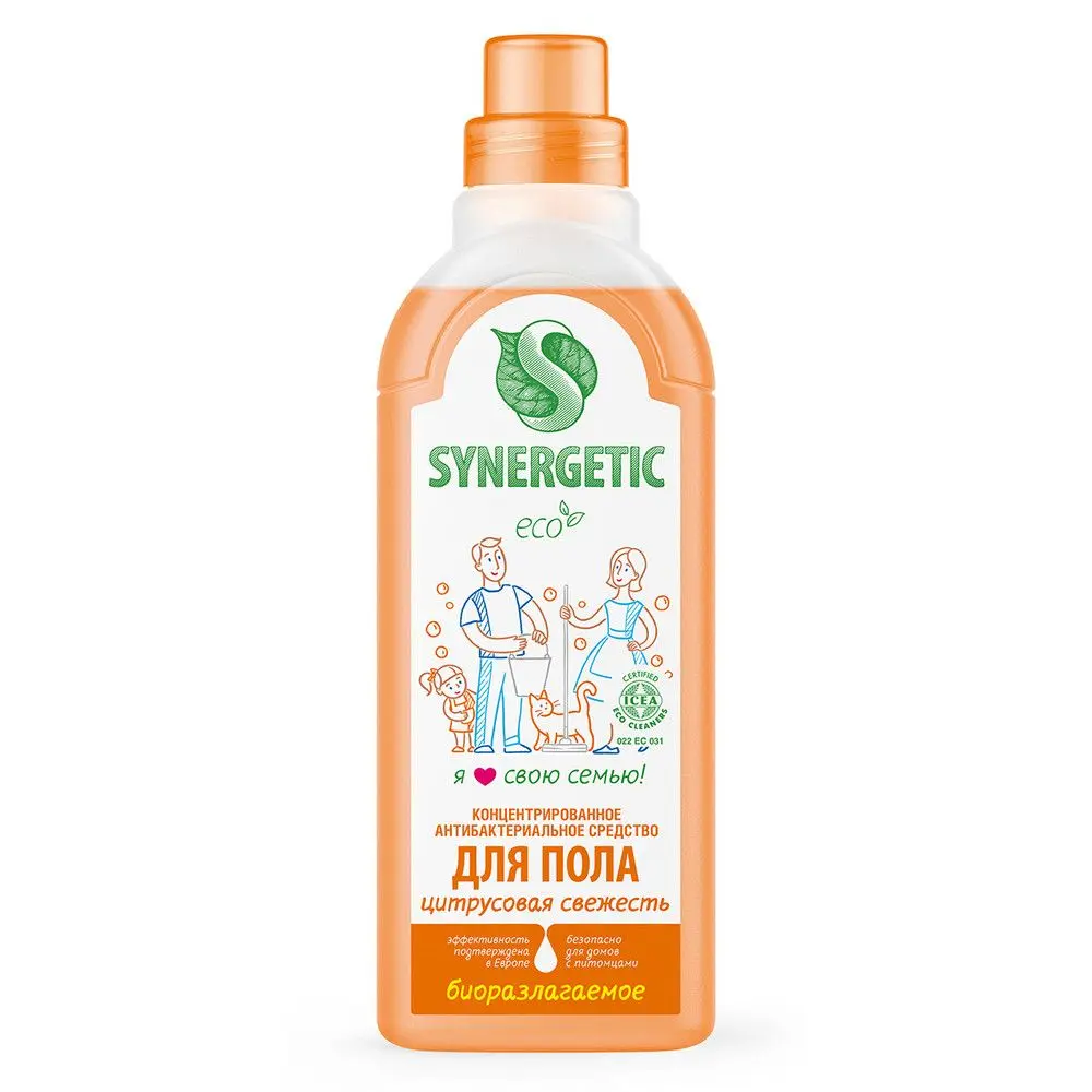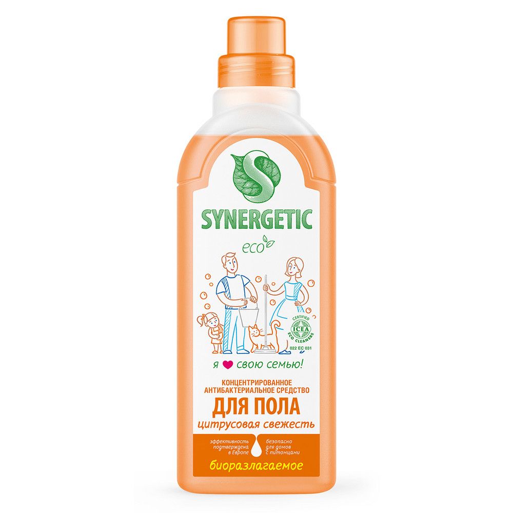 Биоразлагаемое концентрированное средство с антибактериальным эффектом SYNERGETIC "Цитрусовая свежесть" - универсальное средство для ежедневной и генеральной уборки пола и других поверхностей: столов, стен, потолка. Уникальный комплекс растительных тензидов эффективно удаляет загрязнения и неприятные запахи даже в холодной воде. Комплекс зеленых хелатов предотвращает повторное оседание загрязнений на поверхности. Подходит для паркета, ламината, плитки, линолеума, металла, стекла, пластика, дерева. Гипоаллергенная парфюмерная композиция на основе эфирных масел лимона, петитгрейна, лайма и лемонграсса оставляет легкий и приятный аромат. Международный экологический сертификат ICEA подтверждает биоразлагаемость, безопасность и эффективность средства. Оно не требует смывания, не оставляет разводов на поверхности, подходит для уборки в детских комнатах и учреждениях, а также безопасно для домов с питомцами.