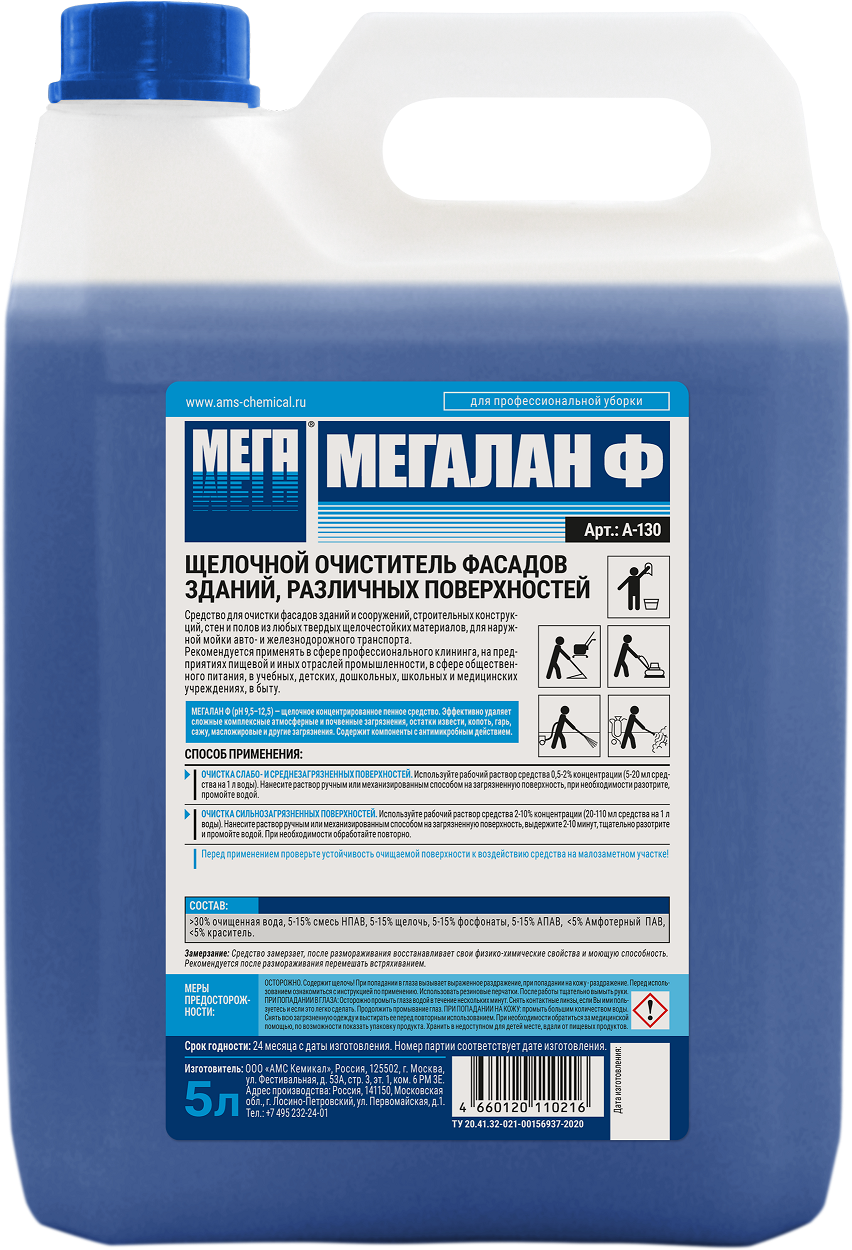 Щелочной очиститель для фасадов зданий и различных поверхностей МЕГАЛАН Ф для удаления сложных комплексных атмосферных и почвенных загрязнений, остатков извести, копоти, гари, сажи, масложировых и других загрязнений. Применяется для чистки, фасадов, натуральных и синтетических полов, поверхностей авто и железнодорожного транспорта.