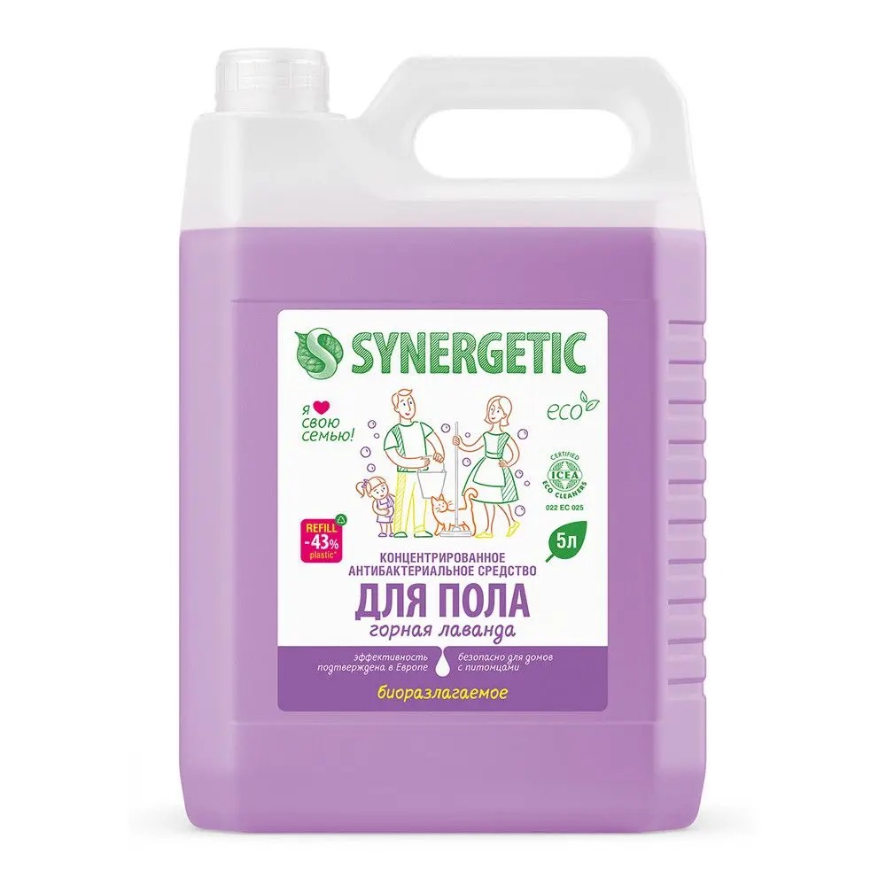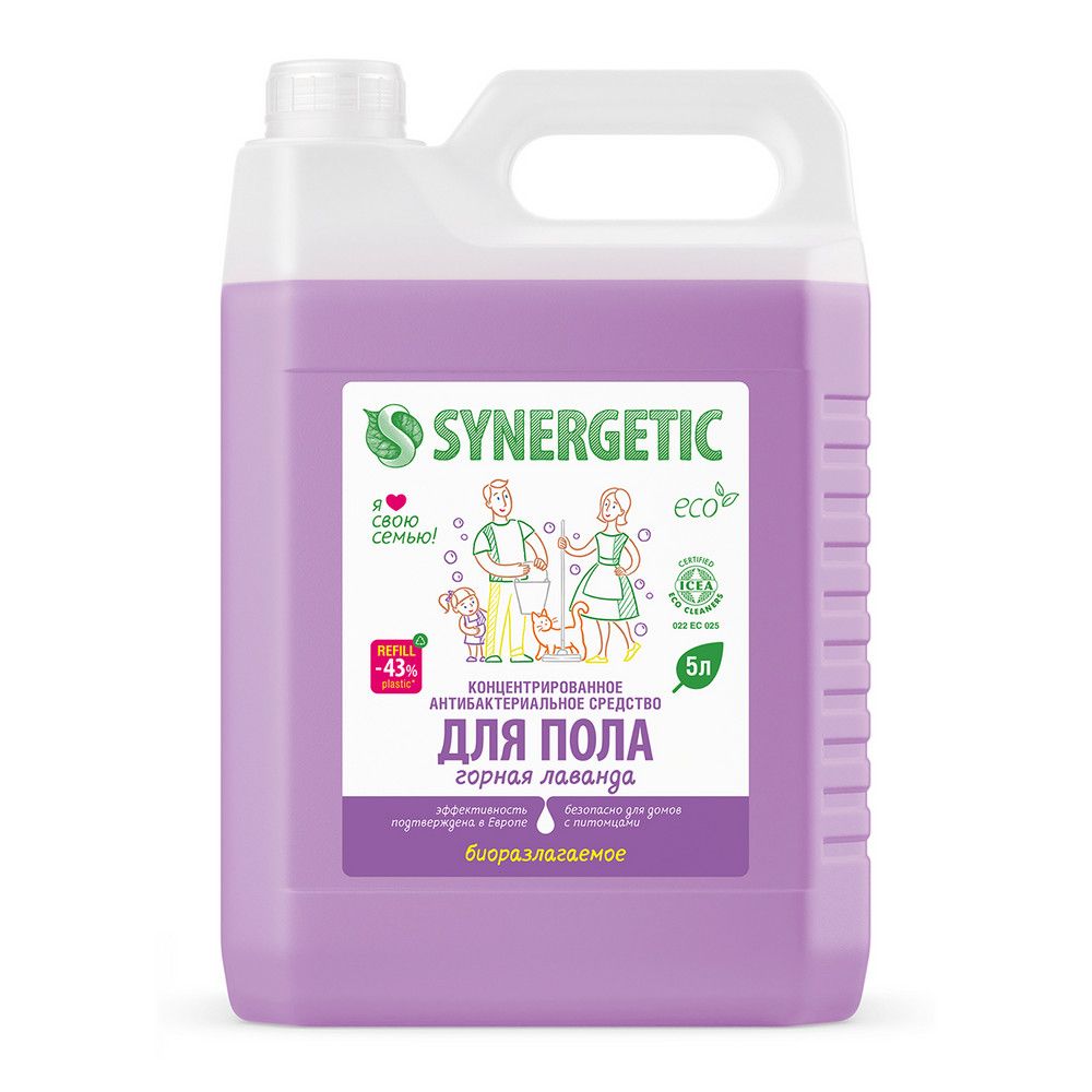 Биоразлагаемое концентрированное средство с антибактериальным эффектом SYNERGETIC "Горная лаванда" - универсальное средство для ежедневной и генеральной уборки пола и других поверхностей: столов, стен, потолка. Уникальный комплекс растительных тензидов эффективно удаляет загрязнения и неприятные запахи даже в холодной воде. Комплекс зеленых хелатов предотвращает повторное оседание загрязнений на поверхности. Подходит для паркета, ламината, плитки, линолеума, металла, стекла, пластика, дерева. Гипоаллергенная парфюмерная композиция на основе эфирных масел лаванды, бергамота и шалфея оставляет легкий и приятный аромат. Международный экологический сертификат ICEA подтверждает биоразлагаемость, безопасность и эффективность средства. Оно не требует смывания, не оставляет разводов на поверхности, подходит для уборки в детских комнатах и учреждениях, а также безопасно для домов с питомцами.