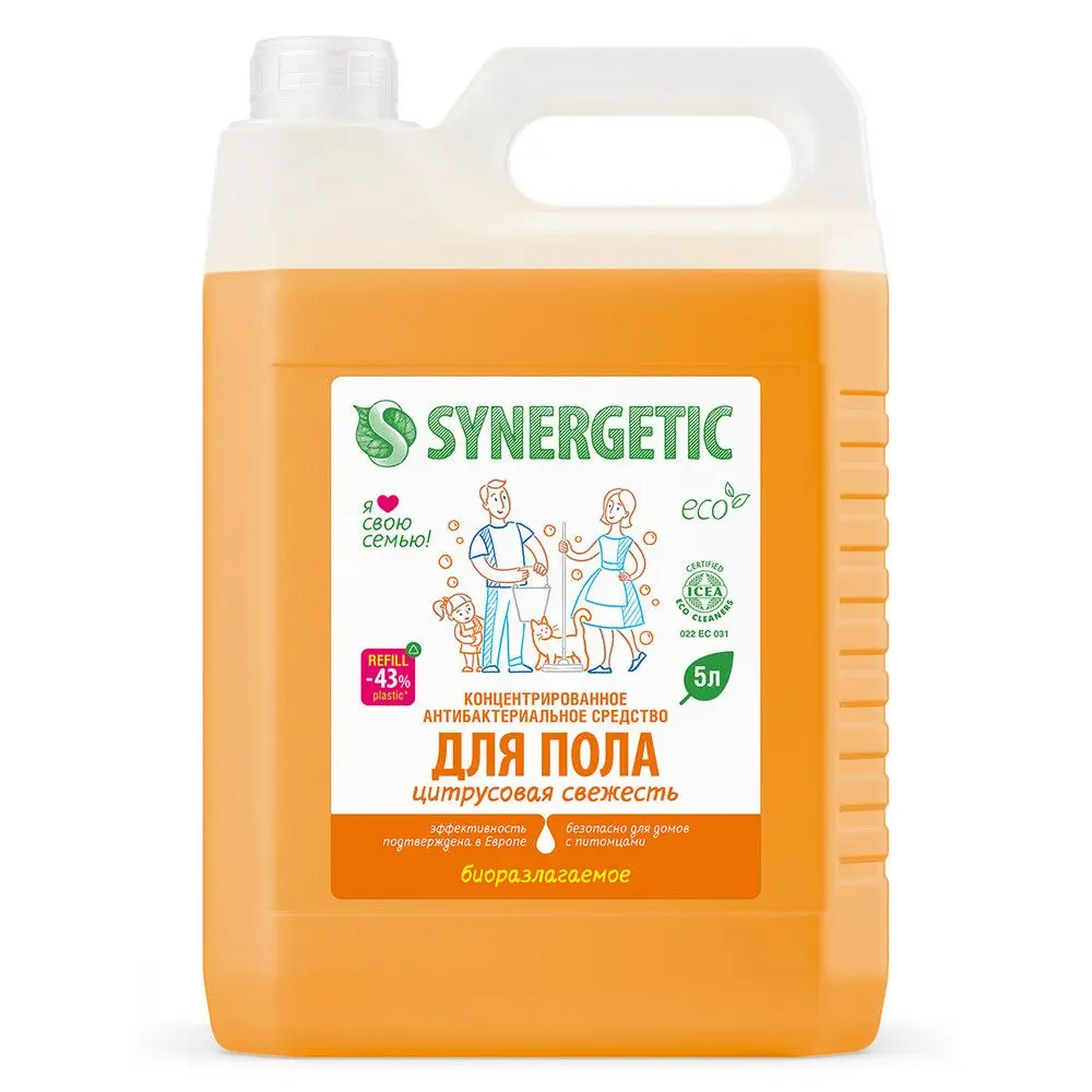 Универсальное концентрированное биоразлагаемое экологичное средство для мытья пола SYNERGETIC «Цитрусовая свежесть» идеально для ежедневной и генеральной уборки поверхностей: столов, стен, потолка, ламината, паркета, плитки, линолеума, металла, стекла, пластика, дерева и других. Подходит для уборки в детских комнатах и учреждениях, для мытья полов с животными, питомцами, собаками, кошками (от запаха животных), после ремонта, для робота пылесоса (если разрешено инструкцией), дома, в квартире и на даче, кухонных, глянцевых, матовых, деревянных фасадов, натяжных потолков. Уникальный комплекс растительных тензидов эффективно удаляет загрязнения и неприятные запахи даже в холодной воде. Комплекс зеленых хелатов предотвращает повторное оседание загрязнений на поверхности. Международный экологический сертификат ICEA подтверждает биоразлагаемость, безопасность и эффективность средства. Не требует смывания, не оставляет разводов на поверхности. Безопасно для домов с питомцами. Содержит гипоаллергенную отдушку с натуральными эфирными маслами лимона, петитгрейна, лайма, лемонграсса.