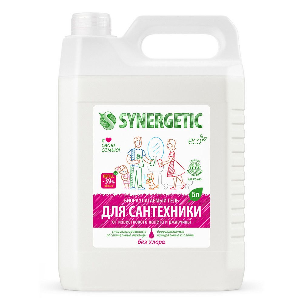 Биоразлагаемое универсальное средство для сантехники SYNERGETIC - концентрированное чистящее средство для ежедневной уборки поверхностей, устойчивых к кислотным моющим средствам, в ванных комнатах и санузлах: унитаза, раковины, ванны, душевой кабины, керамической плитки, акриловых, фаянсовых и эмалированных поверхностей. Комплекс натуральных кислот (лимонной, гликолевой и молочной) и Н-тензидов, полученных из растительного масла, устраняет известковый налёт, ржавчину, камень и минеральные загрязнения даже в холодной и жесткой воде. Средство с антибактериальным эффектом убивает микробы и бактерии, а также эффективно устраняет неприятные запахи. Гипоаллергенная парфюмерная композиция с маслами сантала, бергамота, мяты и лимона оставляет свежий аромат. Международный экологический сертификат ICEA подтверждает биоразлагаемость, безопасность и эффективность средства. Средство полностью смывается водой, не содержит хлор, фосфаты, оптические отбеливатели, SLS, SLES, агрессивные кислоты и ПАВ. Биоразлагаемые компоненты не вредят микрофлоре септических установок.