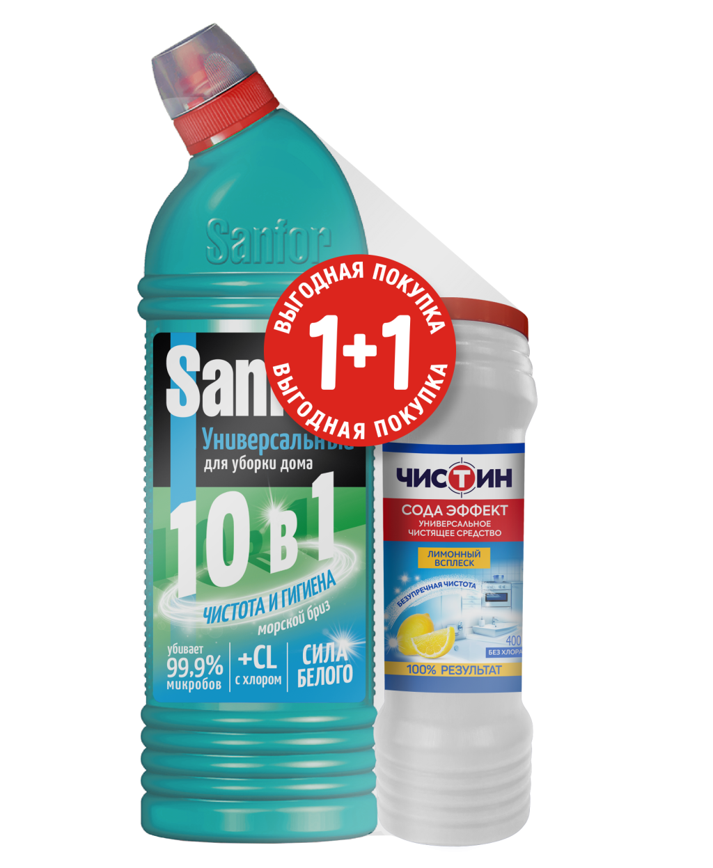 Набор sanfor universal 10 в1 средство для чистки и дезинф морской бриз 750 мл+чистин 400 лимонный всплеск промо