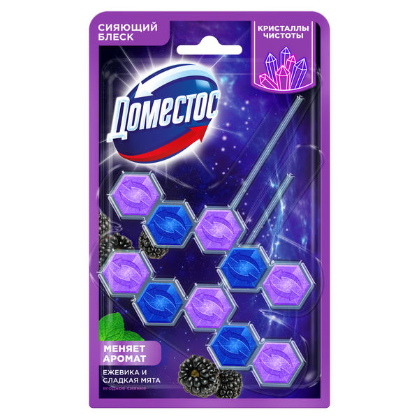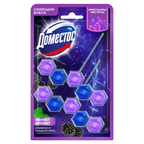Ищете способ поддерживать чистоту унитаза без ежедневных хлопот? Туалетный блок для унитаза подвесной Доместос Кристаллы чистоты станет вашим надежным помощником. Это средство эффективно справляется с тремя важными задачами одновременно: устраняет известковый налет, создает защитный барьер от загрязнений и наполняет пространство приятным ароматом - запах меняется при контакте с водой. Ароматизатор для унитаза подвесной в наборе из 2-х штук обеспечивает долговременный уход за унитазом. Достаточно просто разместить блок под ободок - и он начнет действовать при каждом смыве, гарантируя безупречную чистоту и сияющий блеск без дополнительных усилий с вашей стороны! Также как и таблетки для унитаза, туалетные шарики для унитаза с запахом с кристаллами чистоты в составе обеспечивают обильную пену при смывании, поддерживают гигиену туалета и создают приятный аромат. Чистящее средство для унитаза от запаха и известкового налета одинаково эффективно в течение всего срока действия. Очищающий гигиенический блок для унитаза подвесной с эффектом антиналет дарит ощущение кристальной чистоты: очищающие компоненты работают незаметно, а результат виден сразу! Во время смыва воды в туалете универсальный освежитель для унитаза подвесной для очистки унитаза Доместос Кристаллы чистоты Ягодное сияние окутывает пространство сочным ароматом спелой ежевики — насыщенным, чуть терпким, с фруктовой глубиной. В моменте нота ежевики мягко тает, уступая место прохладной свежести мяты. Этот плавный переход создает удивительный эффект: запах от теплого, обволакивающего начала переходит к бодрящему, кристально чистому финалу.