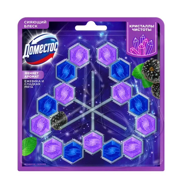 Ищете способ поддерживать чистоту унитаза без ежедневных хлопот? Туалетный блок для унитаза подвесной Доместос Кристаллы чистоты станет вашим надежным помощником. Это средство эффективно справляется с тремя важными задачами одновременно: устраняет известковый налет, создает защитный барьер от загрязнений и наполняет пространство приятным ароматом - запах меняется при контакте с водой. Ароматизатор для унитаза подвесной в наборе из 2-х штук обеспечивает долговременный уход за унитазом. Достаточно просто разместить блок под ободок - и он начнет действовать при каждом смыве, гарантируя безупречную чистоту и сияющий блеск без дополнительных усилий с вашей стороны! Также как и таблетки для унитаза, туалетные шарики для унитаза с запахом с кристаллами чистоты в составе обеспечивают обильную пену при смывании, поддерживают гигиену туалета и создают приятный аромат. Чистящее средство для унитаза от запаха и известкового налета одинаково эффективно в течение всего срока действия. Очищающий гигиенический блок для унитаза подвесной с эффектом антиналет дарит ощущение кристальной чистоты: очищающие компоненты работают незаметно, а результат виден сразу! Во время смыва воды в туалете универсальный освежитель для унитаза подвесной для очистки унитаза Доместос Кристаллы чистоты Ягодное сияние окутывает пространство сочным ароматом спелой ежевики — насыщенным, чуть терпким, с фруктовой глубиной. В моменте нота ежевики мягко тает, уступая место прохладной свежести мяты. Этот плавный переход создает удивительный эффект: запах от теплого, обволакивающего начала переходит к бодрящему, кристально чистому финалу.