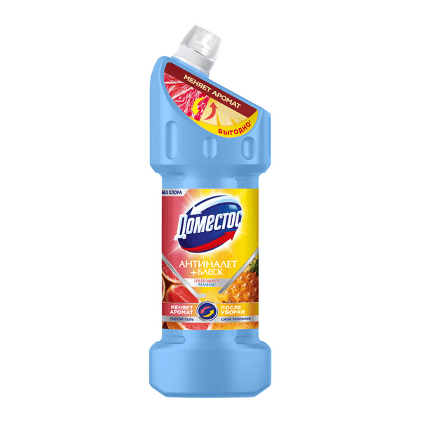 Универсальное чистящее средство, гель для уборки Сила тропиков Антиналет + Блеск от Доместос — это ваш незаменимый помощник в мире бытовой химии, который сочетает в себе мощную формулу и приятный аромат. Этот густой гель имеет яркий аромат грейпфрута, который после уборки сменяется на запах тропического ананаса. Продукт обеспечивает чистоту и свежесть в вашем доме, эффективно борется с известковым налетом и стойкими загрязнениями. Преимущества: - Антибактериальные свойства, удаляющие до 100% бактерий' - Эффективное удаление стойких загрязнений - Меняет аромат в процессе уборки - Густой гель = экономичный расход - Антиналет + Блеск Это эффективное средство подходит для чистки сантехники. Гель эффективно справляется с известковым налетом и стойкими загрязнениями. Средство для чистки ванны и раковины легко использовать: просто нанесите гель на поверхность, обработайте щеткой и тщательно смойте. Для достижения наилучших результатов рекомендуется использовать гель для чистки унитаза ежедневно.