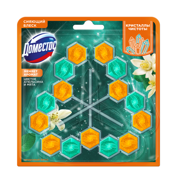 Ищете способ поддерживать чистоту унитаза без ежедневных хлопот? Туалетный блок для унитаза подвесной Доместос Кристаллы чистоты станет вашим надежным помощником. Это средство эффективно справляется с тремя важными задачами одновременно: устраняет известковый налет, создает защитный барьер от загрязнений и наполняет пространство приятным ароматом - запах меняется при контакте с водой. Ароматизатор для унитаза подвесной в наборе из 3-х штук обеспечивает долговременный уход за унитазом. Достаточно просто разместить блок под ободок - и он начнет действовать при каждом смыве, гарантируя безупречную чистоту и сияющий блеск без дополнительных усилий с вашей стороны! Также как и таблетки для унитаза, туалетные шарики для унитаза с запахом с кристаллами чистоты в составе обеспечивают обильную пену при смывании, поддерживают гигиену туалета и создают приятный аромат. Чистящее средство для унитаза от запаха и известкового налета одинаково эффективно в течение всего срока действия. Очищающий гигиенический блок для унитаза подвесной с эффектом антиналет дарит ощущение кристальной чистоты: очищающие компоненты работают незаметно, а результат виден сразу! Во время смыва воды в туалете универсальный освежитель для унитаза подвесной для очистки унитаза Доместос Кристаллы чистоты Цитрусовый блеск окутывает пространство ярким ароматом цветков апельсина - тонкий, свежий и одновременно теплый. В моменте нота мягко тает, уступая место прохладной свежести нежной мяты. Этот плавный переход создает удивительный эффект: запах от сочного, цитрусового начала переходит к бодрящему, кристально чистому финалу.