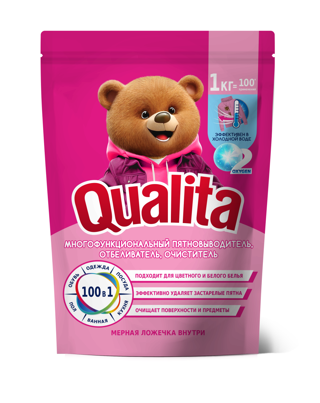 Qualita кислородный многофункциональный отбеливатель пятновыводитель для ткани и поверхностей дой пак 1000 гр
