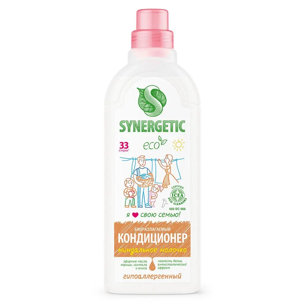Биоразлагаемый кондиционер-ополаскиватель для белья SYNERGETIC "Миндальное молочко" – высокоэффективное средство, бережно ухаживающее за всеми типами ткани, в том числе деликатными, и придающее особую мягкость и нежность белью после стирки. Гипоаллергенный кондиционер-ополаскиватель нейтрализует остатки средств для стирки на ткани, помогает сохранить структуру ткани, защищая волокна от изнашивания и повреждения. Средство обладает антистатическим эффектом. Комплекс растительных К-тензидов обеспечивает легкую глажку белья после стирки и высыхания. Гипоаллергенная парфюмерная композиция с эфирными маслами корицы, сантала и аниса придает белью нежный и приятный аромат. Подходит для ручной и машинной стирки, полностью выполаскивается из тканей. Международный экологический сертификат ICEA подтверждает биоразлагаемость, безопасность и эффективность средства. Биоразлагаемые компоненты не вредят микрофлоре септических установок.