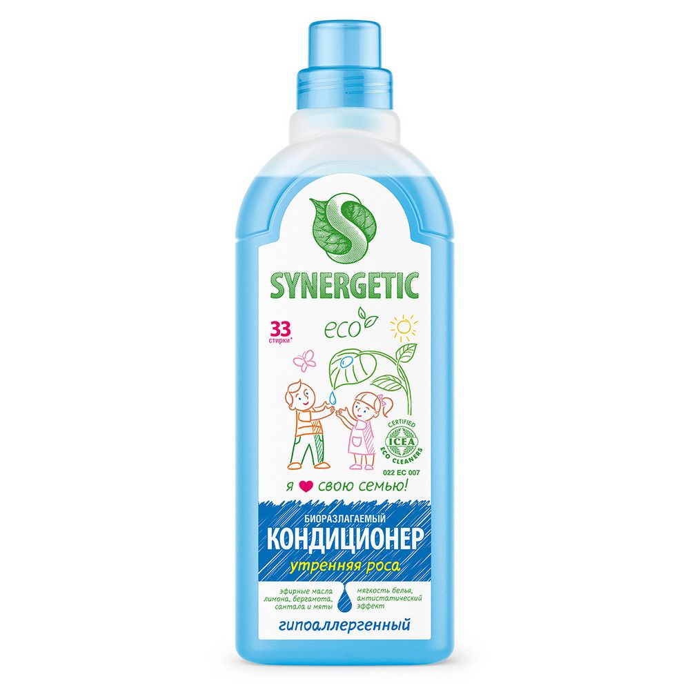 Биоразлагаемый кондиционер-ополаскиватель для белья SYNERGETIC "Утренняя роса" – высокоэффективное средство, бережно ухаживающее за всеми типами ткани, в том числе деликатными, и придающее особую мягкость и нежность белью после стирки. Гипоаллергенный кондиционер-ополаскиватель нейтрализует остатки средств для стирки на ткани, помогает сохранить структуру ткани, защищая волокна от изнашивания и повреждения. Средство обладает антистатическим эффектом. Комплекс растительных К-тензидов обеспечивает легкую глажку белья после стирки и высыхания. Гипоаллергенная парфюмерная композиция с эфирными маслами лимона, бергамота, сантала и мяты придает белью свежий аромат. Подходит для ручной и машинной стирки, полностью выполаскивается из тканей. Международный экологический сертификат ICEA подтверждает биоразлагаемость, безопасность и эффективность средства. Биоразлагаемые компоненты не вредят микрофлоре септических установок.