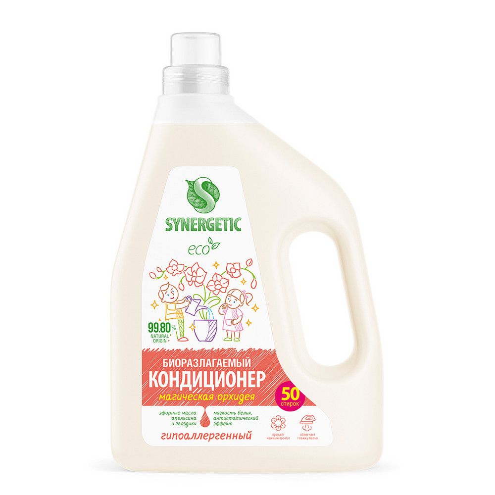Биоразлагаемый кондиционер-ополаскиватель для белья SYNERGETIC "Магическая орхидея" – высокоэффективное средство, бережно ухаживающее за всеми типами ткани, в том числе деликатными, и придающее особую мягкость и нежность белью после стирки. Гипоаллергенный кондиционер-ополаскиватель нейтрализует остатки средств для стирки на ткани, помогает сохранить структуру ткани, защищая волокна от изнашивания и повреждения. Средство обладает антистатическим эффектом. Комплекс растительных К-тензидов обеспечивает легкую глажку белья после стирки и высыхания. Гипоаллергенная парфюмерная композиция с эфирными маслами апельсина и гвоздики придает белью нежный и приятный аромат. Подходит для ручной и машинной стирки, полностью выполаскивается из тканей. Биоразлагаемые компоненты не вредят микрофлоре септических установок.