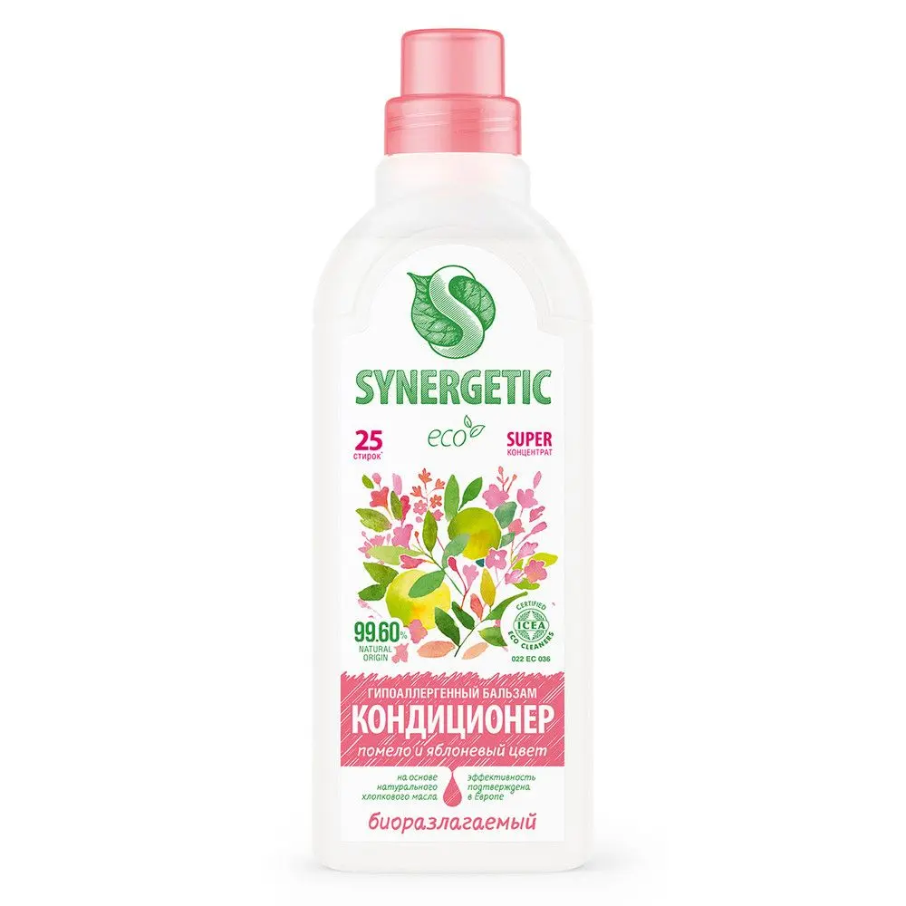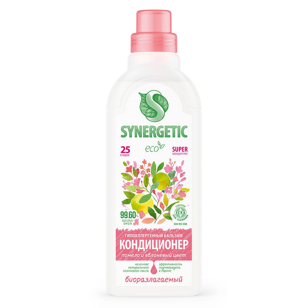 Биоразлагаемый концентрированный гипоаллергенный бальзам-кондиционер для белья SYNERGETIC с нежным ароматом "Помело и яблоневый цвет" на основе масла хлопка придает белью мягкость и способствует его быстрому высыханию после стирки. Средство нейтрализует остатки средств для стирки на ткани, помогает сохранить структуру ткани, защищая волокна от изнашивания и повреждения. Подходит для ручной и машинной стирки, для всех типов ткани, в том числе деликатных, таких как шерсть и шелк. Средство обладает антистатическим эффектом, а содержащийся в нем комплекс растительных К-тензидов обеспечивает легкую глажку одежды. Благодаря современному инновационному компоненту - целлюлазе - бальзам-кондиционер помогает сохранить первоначальный вид белья, препятствует появлению катышков и ворсинок, а также разрушению структуры ткани, возвращая яркость цветам и гладкость волокнам. Растительный биолипид в составе кондиционера снижает риск возникновения раздражения кожи и способствует восстановлению ее липидного слоя. Бальзам-кондиционер подходит для стирки детского белья 0+ и одежды людей с чувствительной кожей.