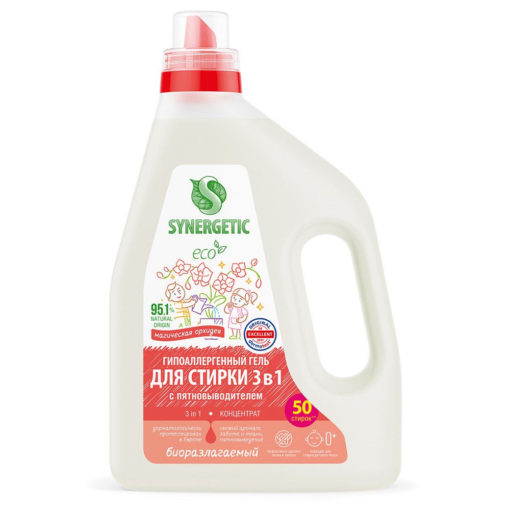 Биоразлагаемый концентрированный гель для стирки всех видов тканей SYNERGETIC 3 IN 1 с ароматом "Магическая орхидея" предназначен для стирки всех видов тканей, кроме деликатных и мембранных, а также шерсти и шелка. Формула 3 в 1 обеспечивает бережное и эффективное очищение тканей, гигиеническую чистоту одежды и устраняет неприятные запахи. Средство можно использовать в стиральных машинах любого типа и при ручной стирке при температуре 15 - 90 °C. Комбинация энзимов и растительных ПАВ эффективно удаляет трудновыводимые и свежие пятна с волокон ткани даже в холодной воде. Функциональные добавки заботятся о ткани, предотвращают окрашивание, сохраняя первоначальный вид, насыщенность цвета, прочность и структуру материала. Гипоаллергенная отдушка на основе эфирных масел апельсина и гвоздики оставляет легкий и приятный аромат. Гель предназначен для стирки всех видов тканей, кроме деликатных и мембранных, а также шерсти и шелка. Биоразлагаемый гель полностью выполаскивается из тканей, подходит для стирки детского белья 0+ и одежды людей с чувствительной кожей