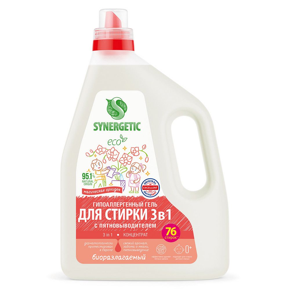 Биоразлагаемый концентрированный гель для стирки всех видов тканей SYNERGETIC 3 IN 1 с ароматом "Магическая орхидея" предназначен для стирки всех видов тканей, кроме деликатных и мембранных, а также шерсти и шелка. Формула 3 в 1 обеспечивает бережное и эффективное очищение тканей, гигиеническую чистоту одежды, удаляя невидимые загрязнения, и устраняет неприятные запахи. Средство можно использовать в стиральных машинах любого типа и при ручной стирке при температуре 15 - 90 °C. Комбинация энзимов и растительных ПАВ эффективно удаляет загрязнения и свежие пятна с волокон ткани даже в холодной воде. Функциональные добавки заботятся о ткани, сохраняя насыщенность цвета, первоначальный вид, прочность и структуру материала. Гипоаллергенная отдушка на основе эфирных масел апельсина и гвоздики оставляет легкий и приятный аромат. Гель предназначен для стирки всех видов тканей, кроме деликатных и мембранных, а также шерсти и шелка. Биоразлагаемый гель легко выполаскивается из тканей, подходит для стирки детского белья 0+ и одежды людей с чувствительной кожей.