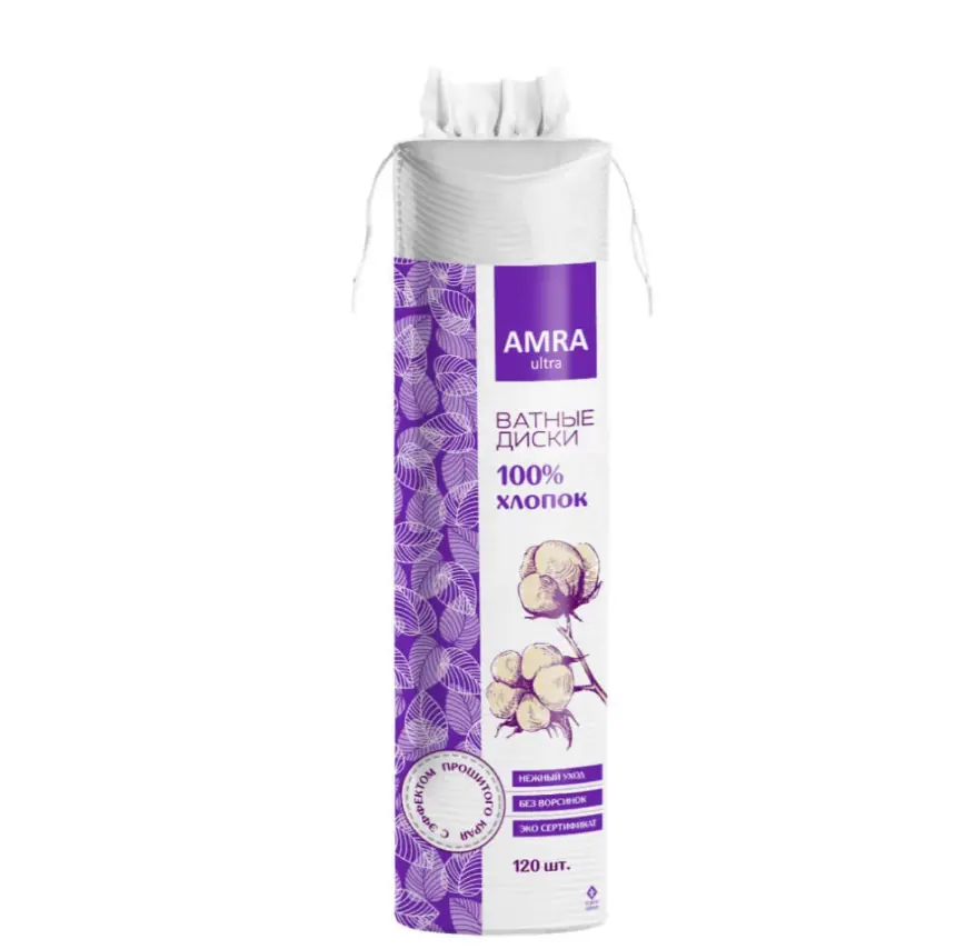 AMRA Ватные диски изготовлены из 100% хлопка, обладающего высокой впитываемостью, что позволяет эффективно удалять излишки косметики. Багодаря нескольким циклам очистки полотно для дисков получается белоснежным, однородным, без ворсинок и посторонних примесей. Все диски AMRA идут с эффектом прошитого края, имеют оптимальную плотность 165 г/м2, что не даёт им расслаиваться при использовании, обеспечивая нежный уход.