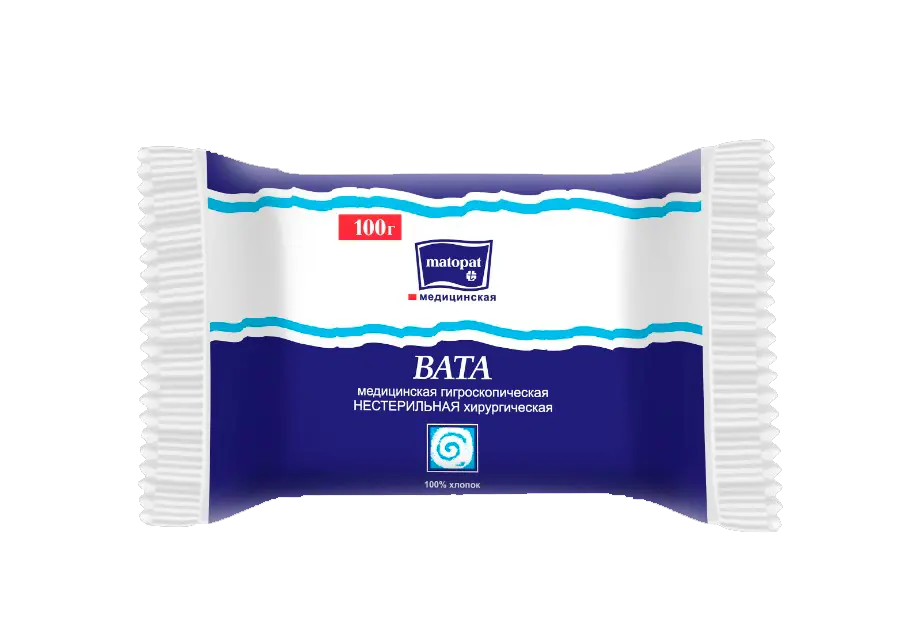 Хлопковая нестерильная вата высшего качества. Обладает высокой гигроскопичностью, Изготовлена из чистых и мягких волокон хлопка.