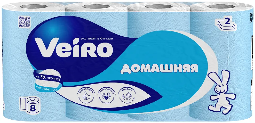 Экономичная туалетная бумага Veiro Домашняя. Туалетная бумага изготовлена из вторичного сырья, двухслойная белого цвета, с тиснением. В упаковке 8 рулонов.