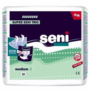 Подгузники Super Seni помогут деликатно и гарантированно решить проблемы, возникающие при энурезе. Предназначаются и для людей с ограниченными возможностями и для активных людей. Имеют гидрофобные боковые бортики, которые расположены внутри и создают дополнительную защиту от протекания. Подгузник снабжен индикатором влагонасыщения, помогающим вовремя определить наступление времени смены изделия. Сдавливания в области пояса помогает избежать эластичная резинка, которая обеспечивает комфортное прилегание к телу человека. В состав подгузников Super Seni входит дополнительный сдвоенный впитывающий слой, содержащий абсорбент высокого качества с антибактериальными свойствами. Он поможет избежать появления неприятных запахов и повысить уровень впитывания. Также по боковым сторонам подгузника расположены двойные эластичные липучки-застежки, позволяющие расстегивать и застегивать подгузник, не рискуя разорвать его внешний слой.